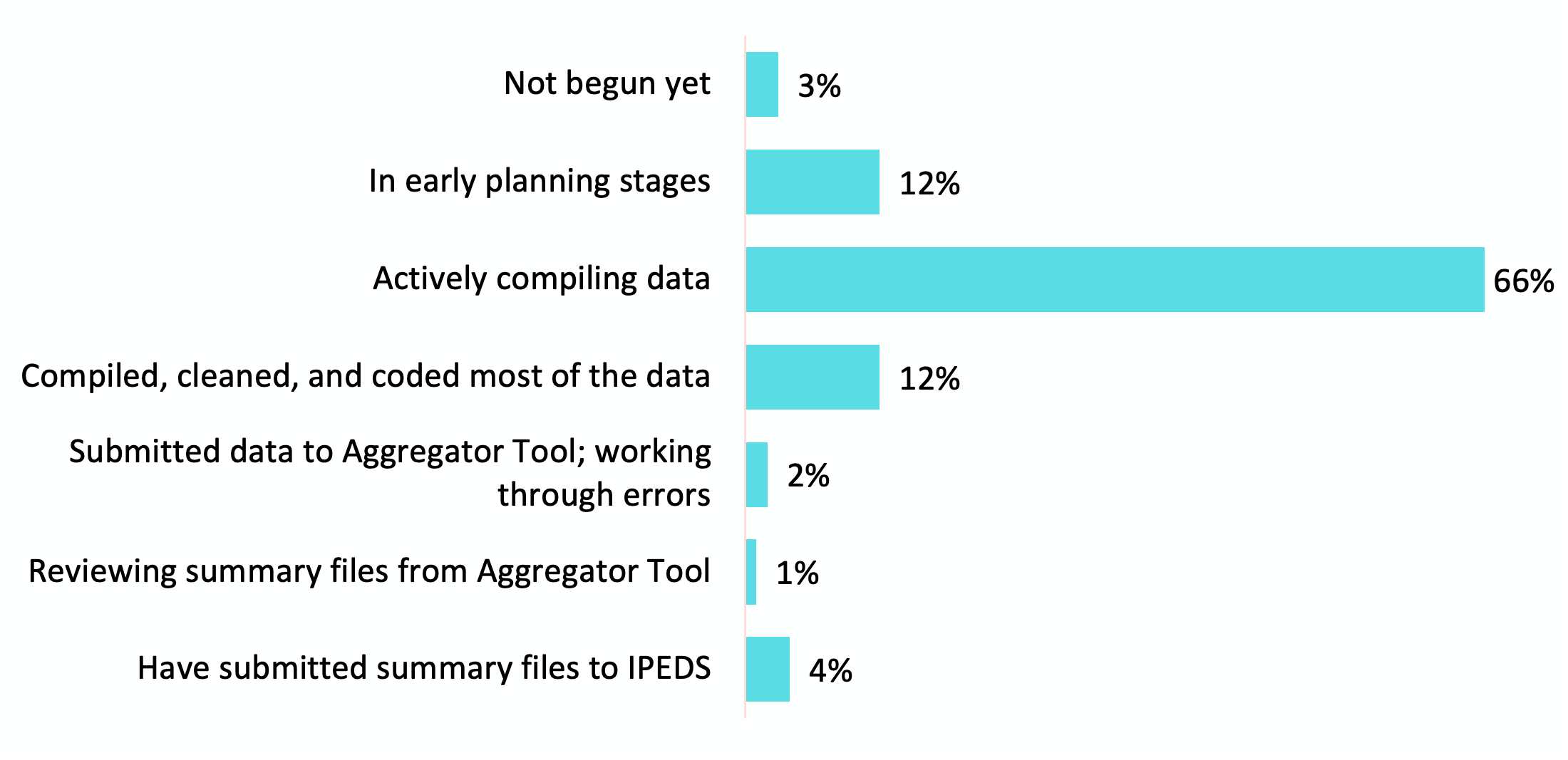 Open-ended responses suggest that institutional progress is constrained primarily by compressed timelines, retroactive data requirements, and concurrent IPEDS reporting obligations. Many respondents emphasized that compiling seven years of historical data, while managing other required submissions, has significantly slowed progress and reduced confidence in meeting the March 18 deadline.
