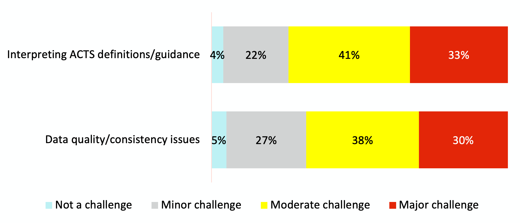 Survey results also indicate that institutions are facing challenges related to interpreting ACTS requirements and ensuring data consistency. Across both areas, most respondents reported experiencing these issues at a moderate or major level (Chart 3).