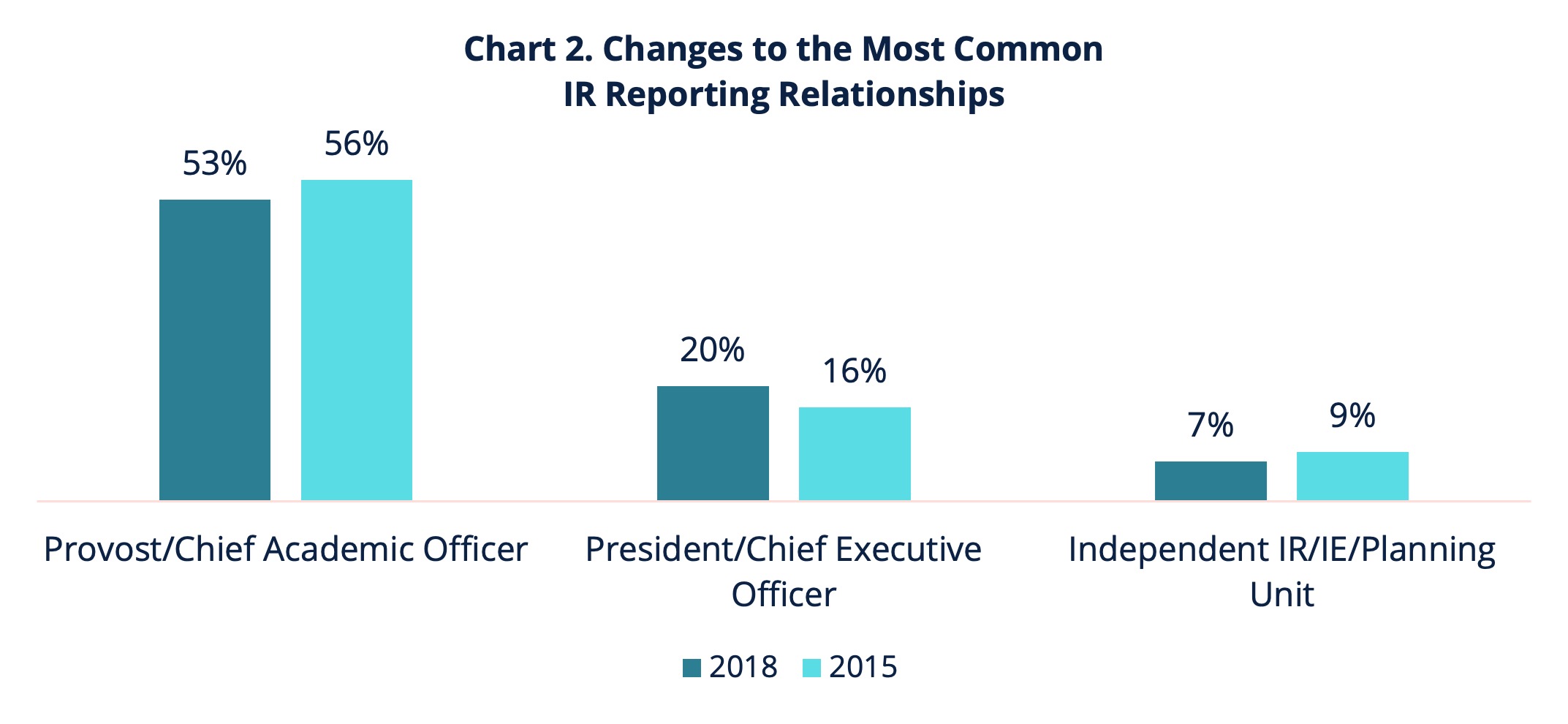 We compared reporting relationships among the 376 institutions that responded to the 2015 and 2018 National Surveys. Overall, fewer IR offices report to the provost or an independent IR/IE/planning unit in 2018 compared to 2015, whereas more IR offices report to the president in 2018 (Chart 2).